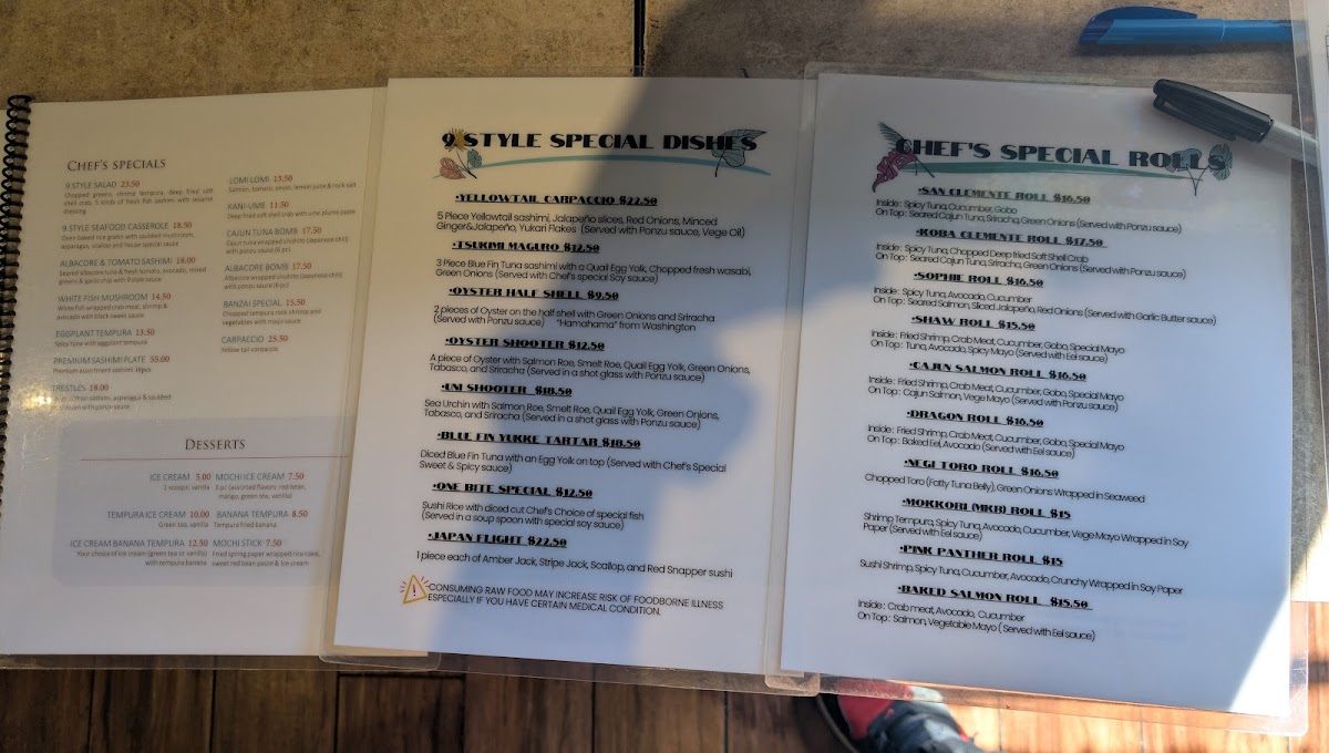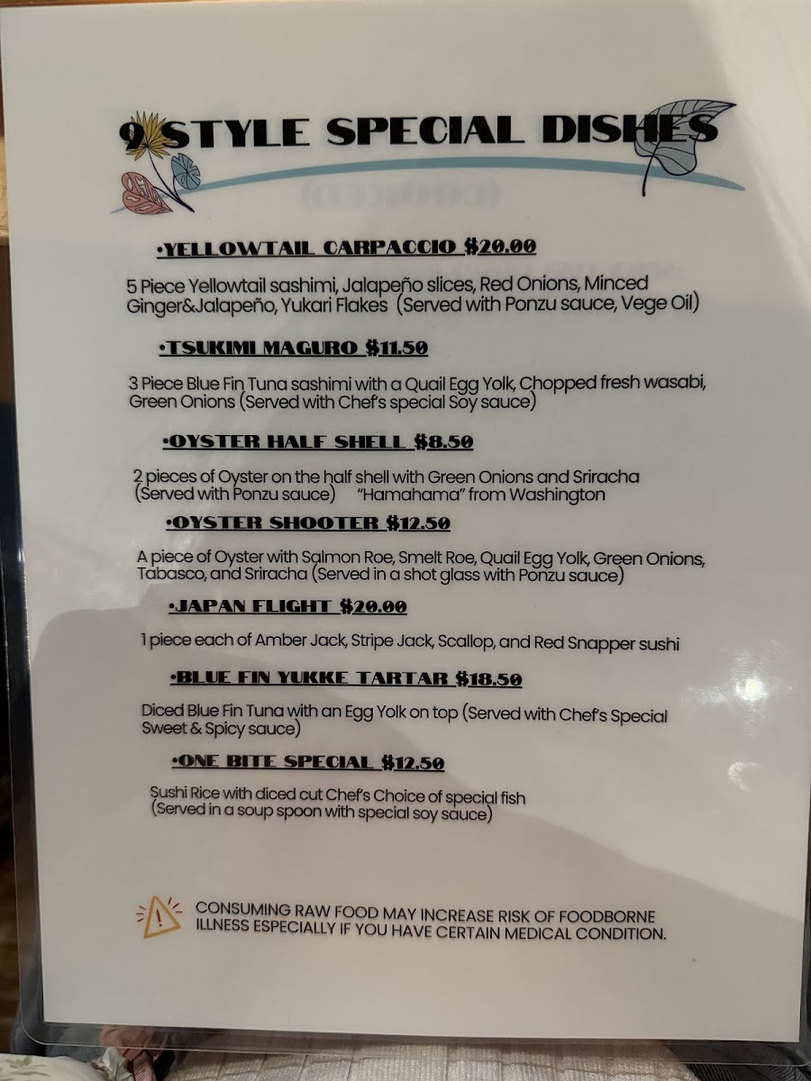 The menu at 9 Style Sushi offers a variety of sushi and Japanese-inspired dishes suitable for casual dining. It is organized into several main categories, including salads, entrees, and bowls, allowing guests to select from light starters to more substantial meals.