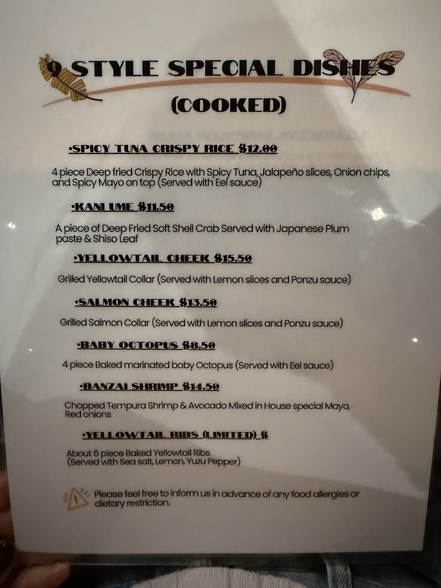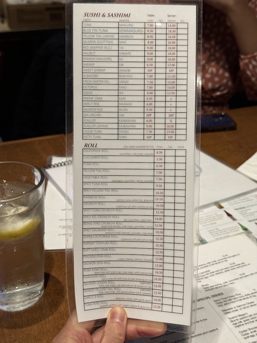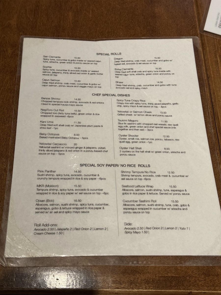 This menu is suitable for lunch or dinner and can accommodate both quick orders and more leisurely meals. Guests can choose from light bites, casual entrées, or comprehensive sushi platters depending on their preferences.